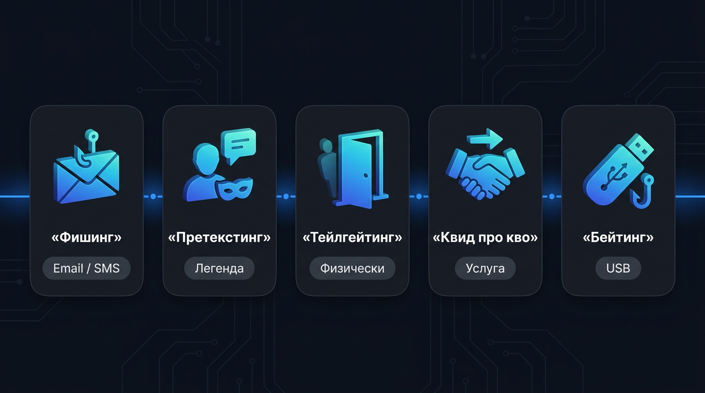 Претекстинг — атакующий создаёт легенду (pretexting): представляется сотрудником IT-поддержки, аудитором, новым коллегой. Выстраивает доверие, затем запрашивает нужную информацию.