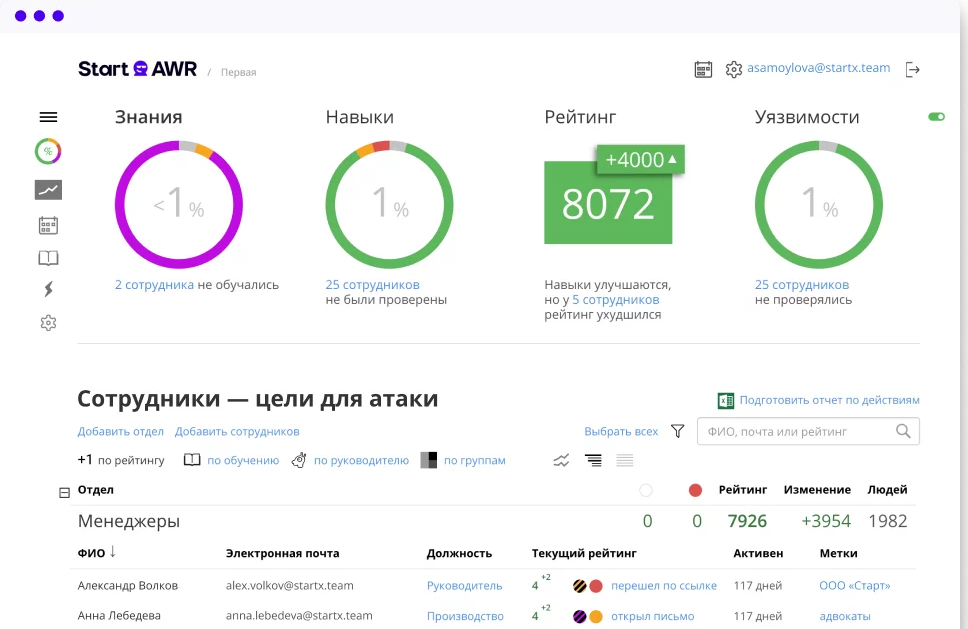 Компания работает с 2016 года и специализируется именно на человеческом факторе в кибербезопасности. Флагманский продукт Start AWR — платформа для контроля уровня защищённости от атак на сотрудников. Отличительная черта: охват всех каналов атак на людей — email, сайты, поддельные WiFi-точки, соцсети и мессенджеры.